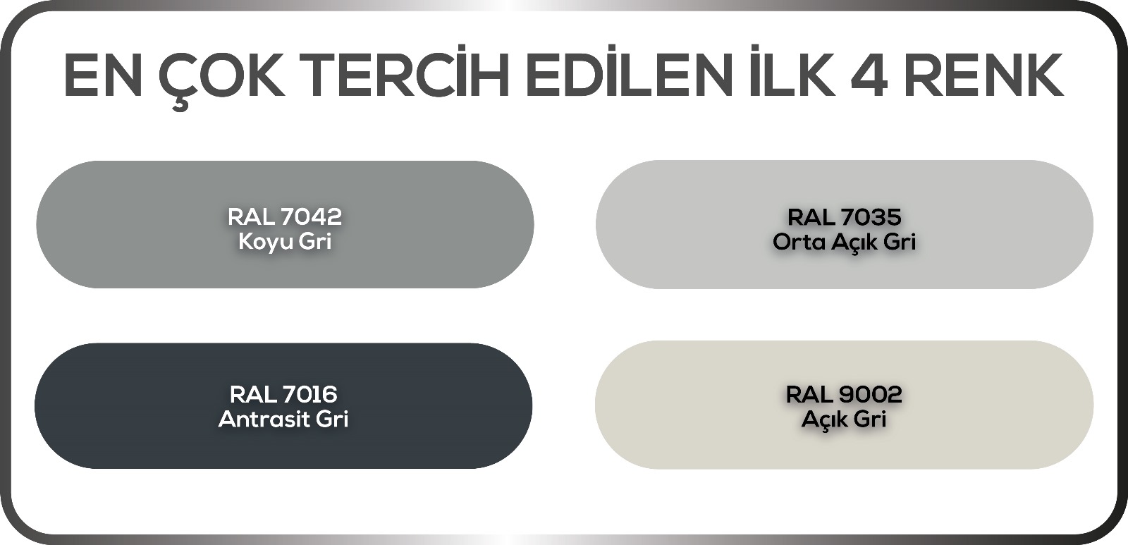 ÖNEMLİ HATIRLATMA : Renk tespitinde bulunurken, duvar boyalarında olduğu gibi sadece kozmetik gerekçeleri baz almak doğru değildir. Zira, üzerinde oluşacak trafikte göz önünde bulundurularak zamanla; kirlenme, aşınma ve dış etken koşulları gibi gerekçelerin tamamını absorbe ederek, daha uzun süreli bir kullanım sunabilmesi çok önemlidir. Asıl kozmetik görünümün ilk uygulama günü değil, zamanla hergün kalıcı olmasıdır. Bu yüzden, 300 adet renk barındıran ZBS renk kartelasının, en çok tercih edilen ve efektif olarak daha uzun dekoratif etkisini muhafaza edebilen, ilk 4 rengini sizlerle paylaşmak istedik.